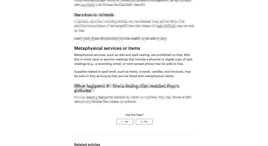 The section reads that Etsy welcomes a wide variety of divination and spell-related items, however spell supplies may not offer metaphysical outcomes, which Lilith’s do.